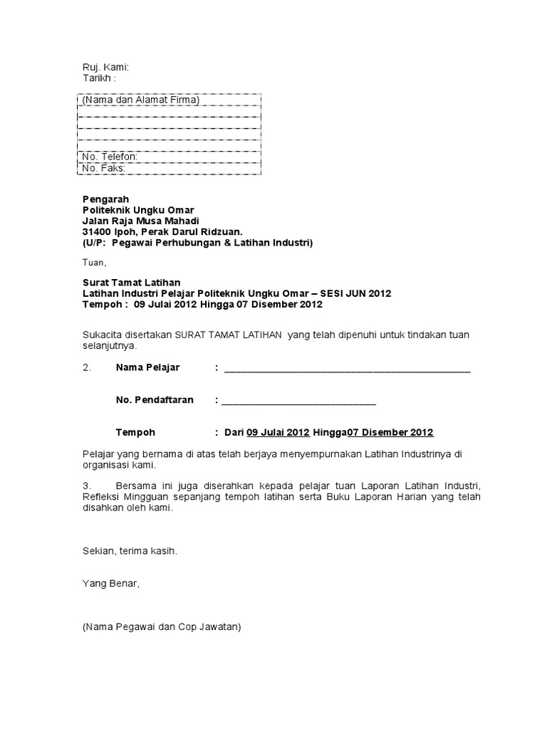Sebelum masuk pada contoh surat keterangan usaha (sku), alangkah baiknya jika kita mengetahui terlebih dahulu dokumen apa saja yang diperlukan untuk. Berikut ini merupakan contoh surat resmi pemerintah, sekolah, perusahaan, osis, dan bahasa inggris yang benar. السلام عليكمberita baik lagi buat semua pelajar politeknik yang akan mengikuti latihan industri pada semester hadapan. 1.2 objektif laporan latihan industri apabila tamat latihan industri yang dijalankan disebuah firma tersebut itu, maka setiap pelajar diharuskan membuat atau menyediakan laporan lengkap dan mengikut piawaian yangtelah ditetapkan oleh pihak politeknik. .sebelum cetak, edit dulu yang mana perlu, mengikut kesesuaian dan keadaan,. .sekadar perkongsian maklumat, disertakan bersama dalam blog ini, contoh surat tamat latihan. Pegawai perhubungan & latihan industri) tuan pengesahan tamat latihan industri. Ambil kesempatan ini dengan merujuk contoh. Sebelum tamat latihan industri, setiap pelajar diminta mendapatkan surat pengesahan tamat latihan dari firma/syarikat. Contoh surat permohonan izin tidak masuk sekolah. Related posts to contoh surat rasmi untuk permohonan latihan industri. Penggunaan surat ini juga biasanya digunakan oleh 1. Ikut contoh surat tolak tawaran untuk latihan industri, internship atau praktikal.